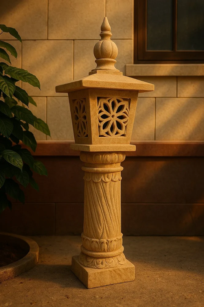 The Outdoor Stone Lamp is designed to bring both functionality and natural beauty to your outdoor spaces. Each lamp is handcrafted by skilled artisans in Rajasthan, ensuring precision, elegance, and timeless appeal. Its smooth surface finish, warm sandstone color, and durable construction make it ideal for luxury gardens, pathways, resorts, and temple courtyards.