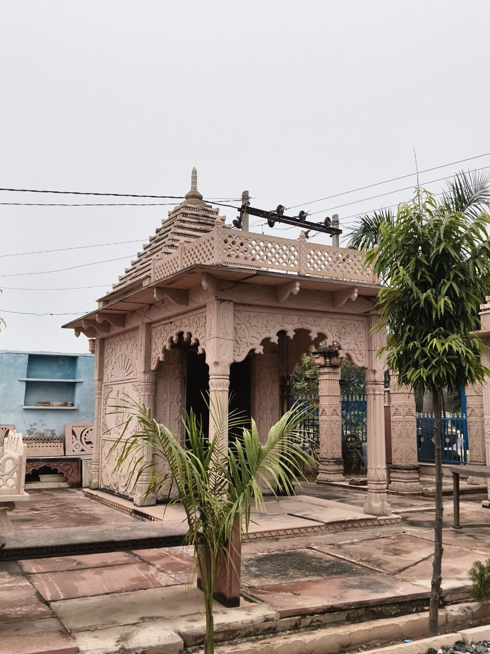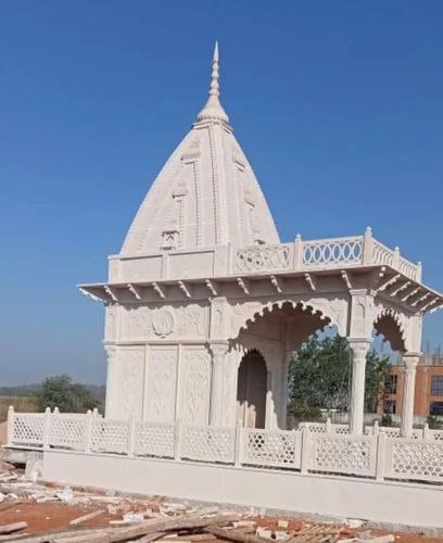 The temple stands 18 feet tall to present a graceful shikhara silhouette, and eight hand-carved pillars support the mandapa and roof — each pillar detailed with floral and geometric motifs rooted in Rajasthani craftsmanship. Bansi Paharpur and Dholpur sandstone are chosen for their consistent grain, excellent carving ability, and long-term color retention; these stones develop a richer patina over time while resisting cracks and erosion.